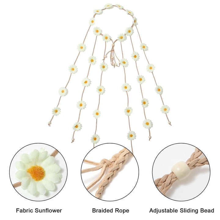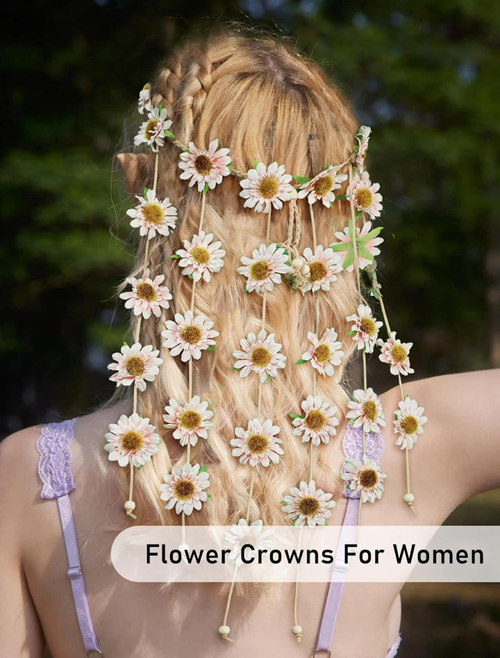 - SPECIAL DESIGN - This hippy flower crown of components are a plenty of white sunflower, braided rope and white beads. we present some fun and easy Hippie hairstyles that'll change your look in no time. This particular piece is cool accessory for festivals as well as part of your city look