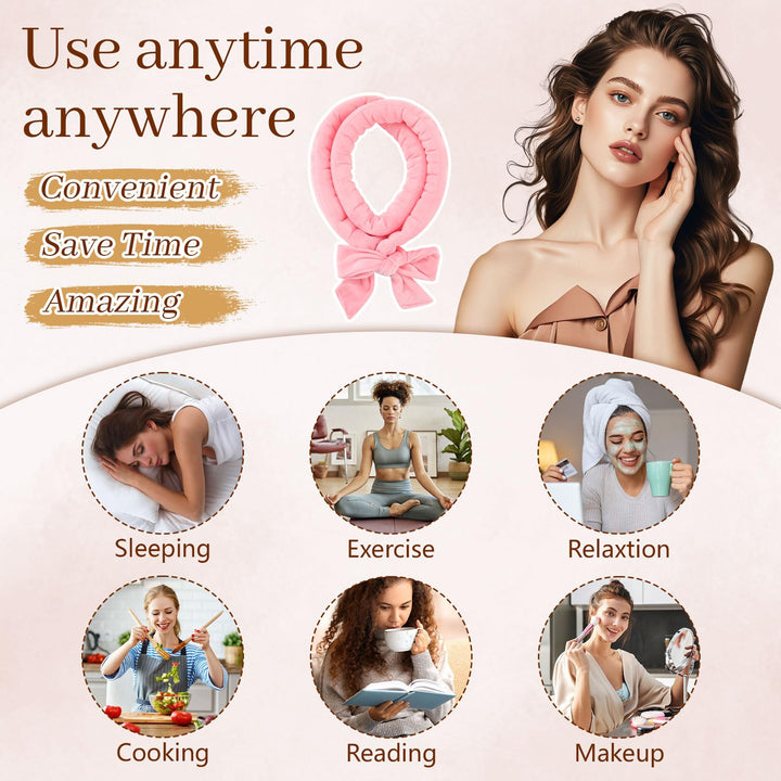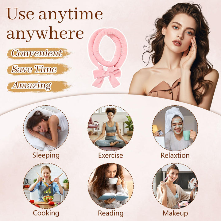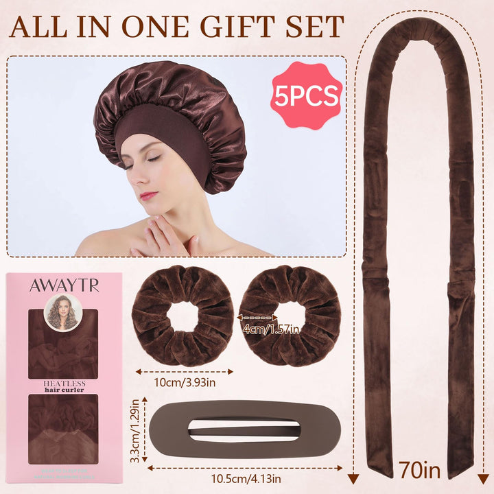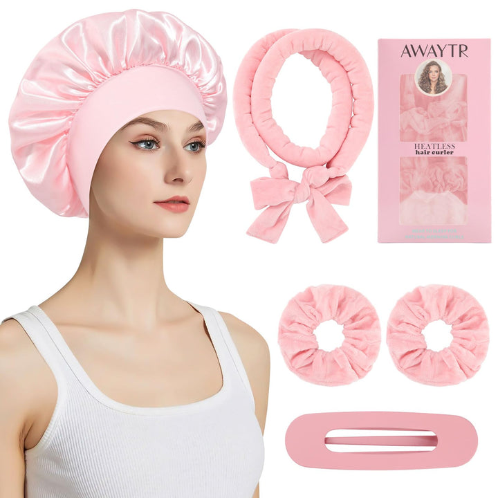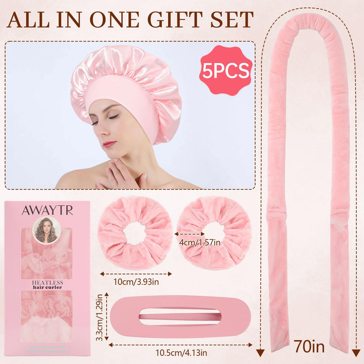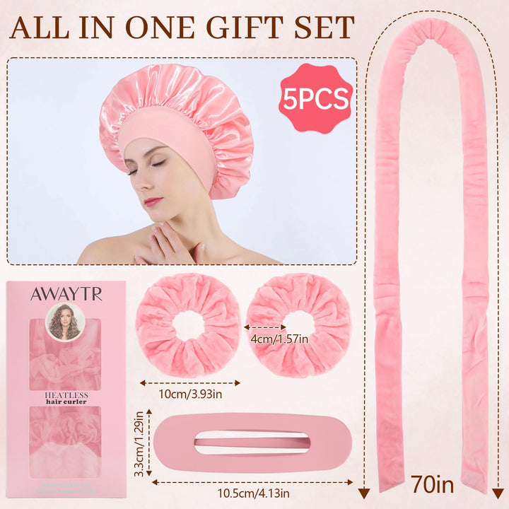 Transform your hair into beautiful, natural curls without heat damage using this innovative 5-piece velvet hair curler set from AWAYTR. The complete set includes everything you need for effortless overnight styling - velvet curlers, 2 scrunchies, a hair clip, and a protective satin bonnet. These soft, comfortable curlers measure 35 inches in length and 1.5 inches in width, making them perfect for creating various curl sizes. The premium velvet material helps reduce friction and prevent hair breakage while you sleep, ensuring a comfortable overnight styling experience. Suitable for all hair types and lengths, these versatile curlers can achieve various styles from loose waves to bouncy curls. They're incredibly easy to use - simply wrap sections of your hair around the curlers before bed, secure them comfortably, and wake up to beautiful, natural-looking curls. Skip the morning styling routine and enjoy salon-worthy results at home with this complete heatless curling solution. The pink velvet curlers are designed for comfort during sleep, allowing you to achieve stunning curls while you rest.